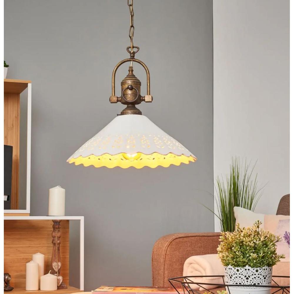 Klasszikus, réz szerkezetes függeszték, 40 cm-es lyukacsos handmade kerámia tányér átmérővel.