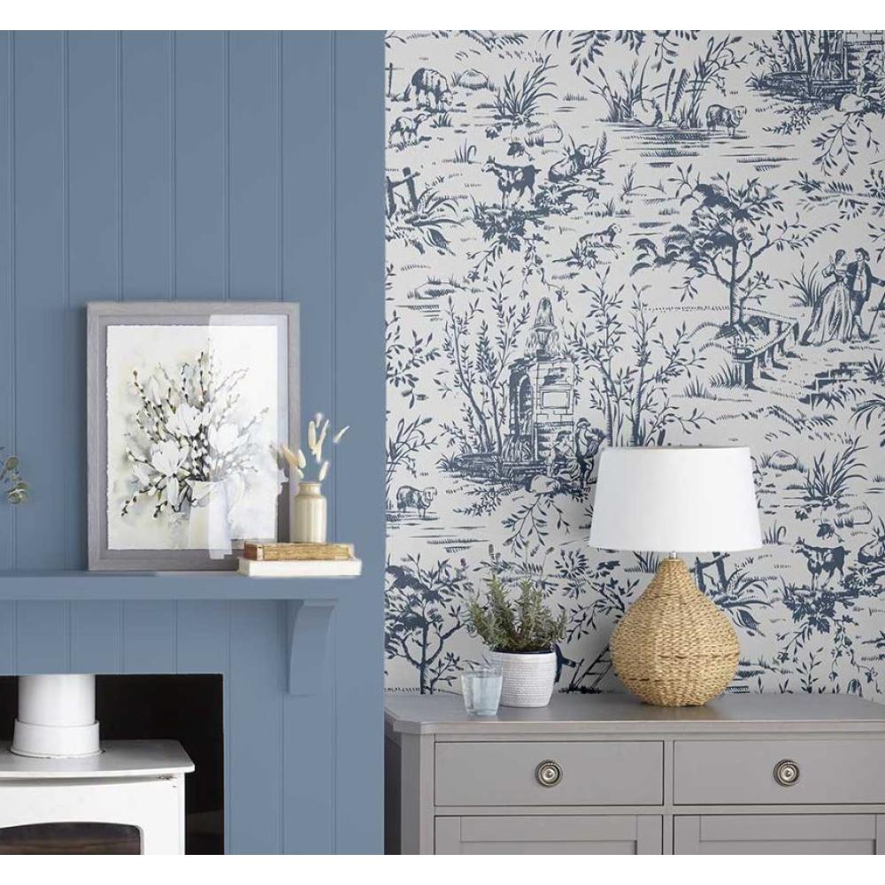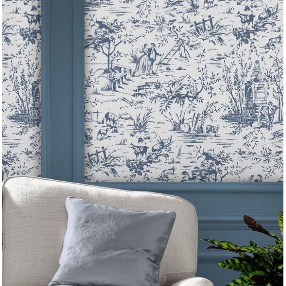 Sötétkék, klasszikus szöttes életkép mintájú, fehér alapú tapéta.