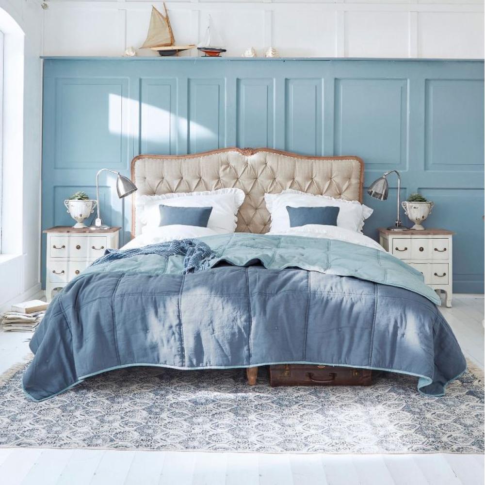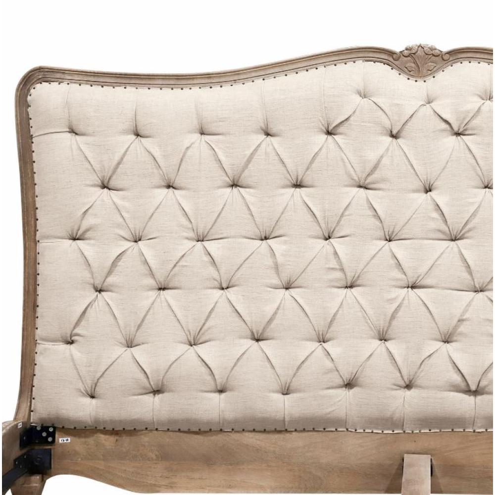 LB Igényes country ágykeret tűzött, natúr lenvászon szövettel készített fejvéggel, faragott mangófa lábakkal / 180x200-as matrachoz