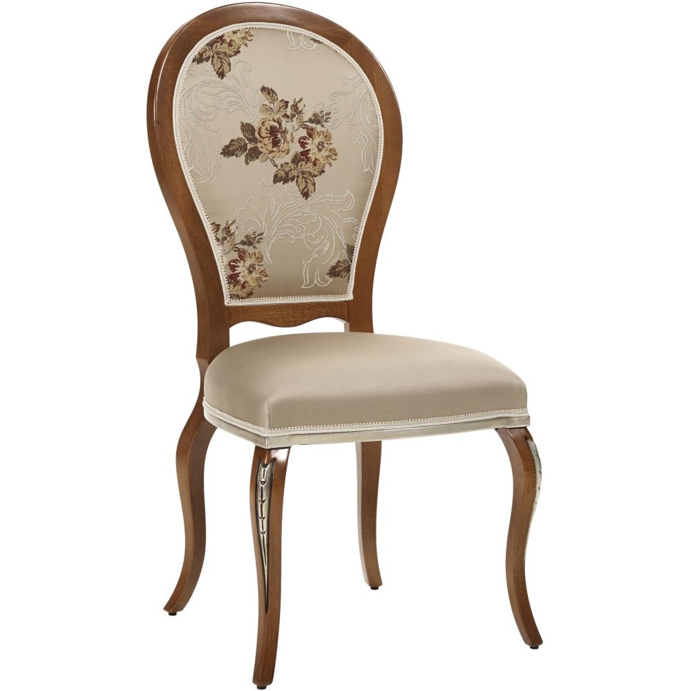 Klasszikus stílusú bükkfa szék, gyönyörű kanyargós vonalakkal. Az ülés hevederrel, három rugóval és kiváló minőségű habbal van párnázva. Az elülső lábakon faragványok találhatók, amelyek ezüst vagy arany lakkozással fokozhatók. A kárpitozás továbbá testre szabható még szegecsekkel és fonással. Ajánljuk elegáns villákba, kastélyba, felső kategóriás polgári szalonokba, nappaliba vagy akár étkezőbe is kiváló. A bútor Olaszországban készül, felső kategóriás, kézzel készült termék!