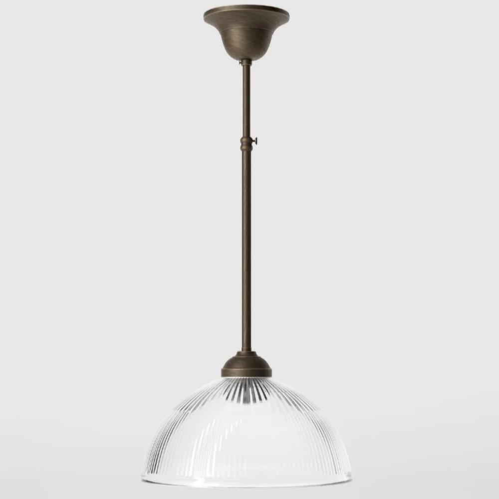 A kollekció kifinomult függesztéke a vintage ipari formatervezés eleganciáját testesíti meg, egy csipetnyi kortárs kifinomultsággal. Az alapvető sárgaréz szerkezet tiszta és geometrikus vonalakkal fejlődik, és egy széles, átlátszó, bordázott üvegbúrában csúcsosodik ki.