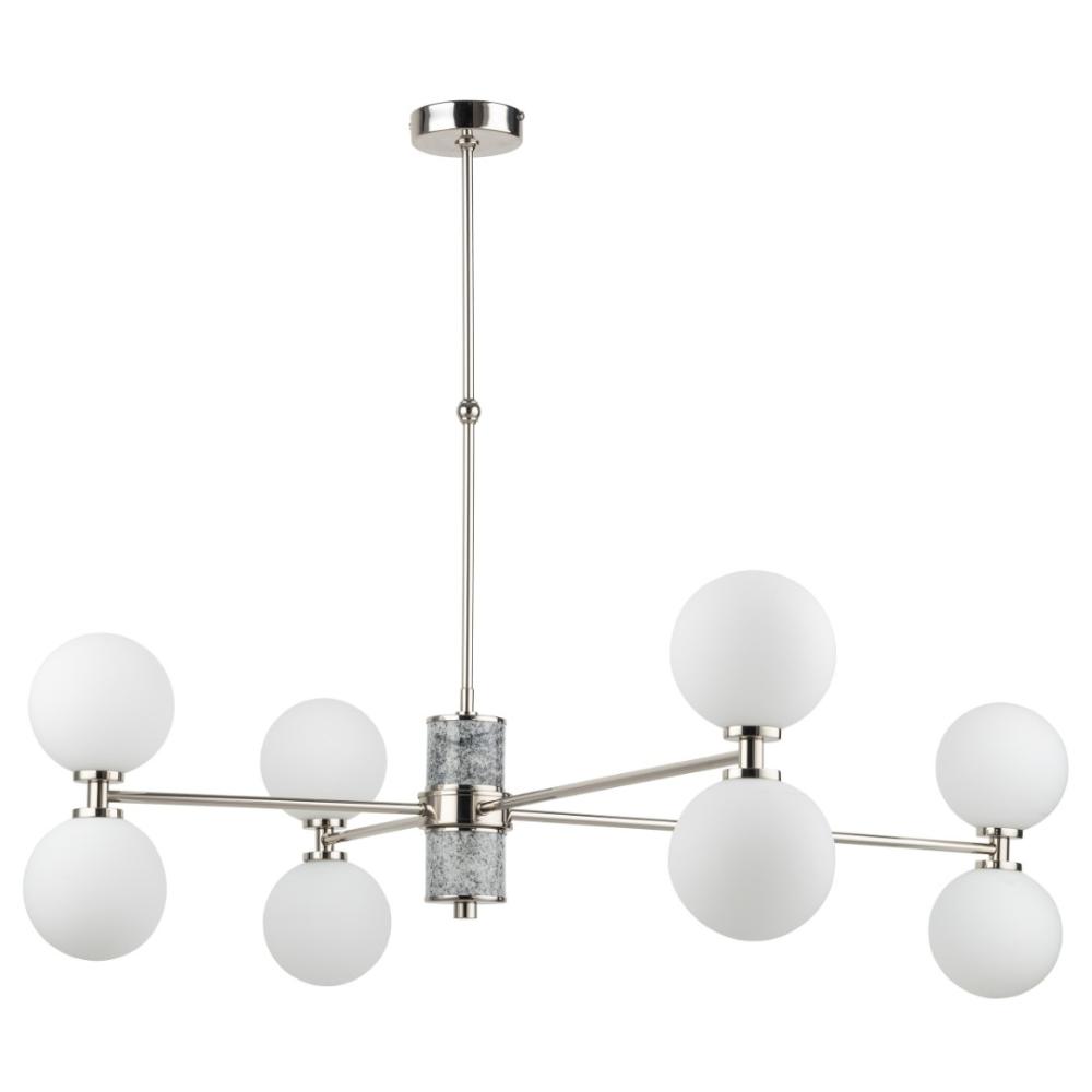 Különleges fényjáték: a 8db fehér, gömb alakú üvegbúra nemcsak lágyítja a fényt, hanem szórt fényt teremt az enteriőrben.