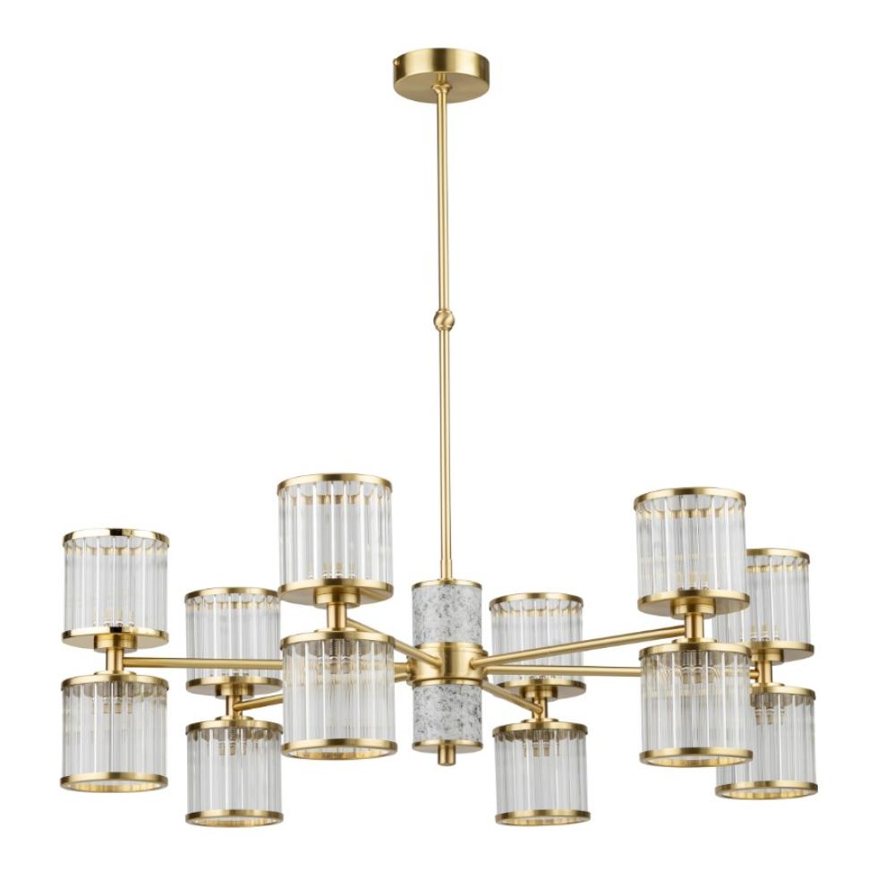 Vigyen időtlen luxust otthonába ezzel a különleges, kettős kialakítású csillárral. A lámpa a fényűző matt arany felületek, a kifinomult márvány és a texturált üveg harmonikus találkozása, amely bármely helyiséget azonnal elegáns lakosztállyá varázsol.