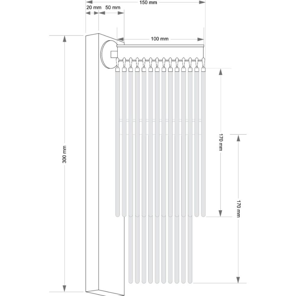 Ez a falikar a fény és a textúra mesteri játéka. A lámpatest legfőbb karakterét a függőlegesen elrendezett, finoman bordázott (17 cm hosszú) pálcák adják, amelyek sűrűn egymás mellé sorolva alkotnak áttetsző palástot a fényforrás köré.