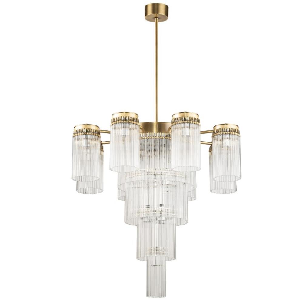Ez a csillár a fény és a textúra mesteri játéka. A lámpatest legfőbb karakterét a függőlegesen elrendezett, finoman bordázott (17 cm hosszú) pálcák adják, amelyek sűrűn egymás mellé sorolva alkotnak áttetsző palástot a fényforrás köré.