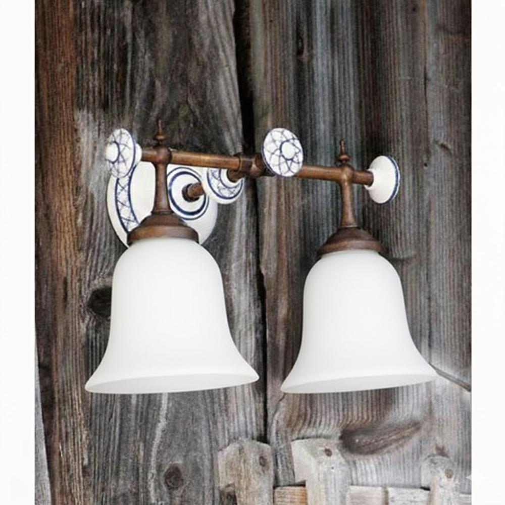 SI Kézzel festett antikolt réz szerkezetű falikar szájjal fújt üvegbúrával, kétizzós / készleten, utolsó 1 db