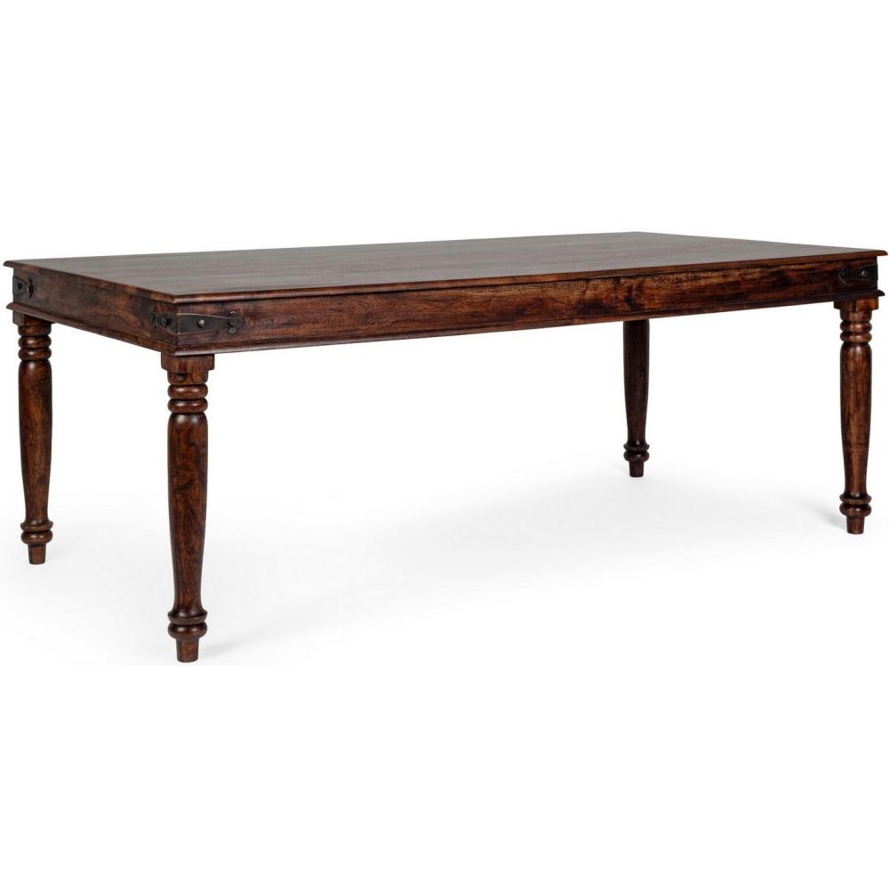 Klasszikus tömör akácfa étkezőasztal, kovácsoltvas pántokkal a sarkaknál.