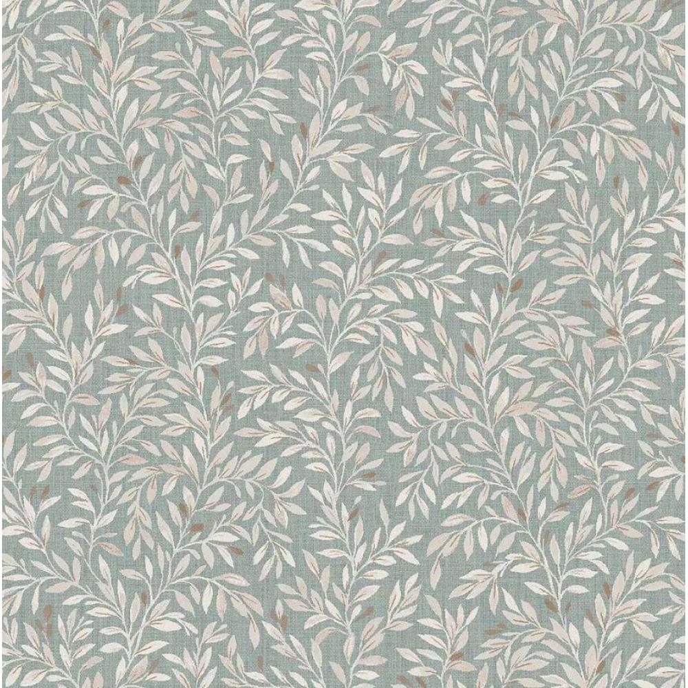Apró,törtfehér és barna levél mintás, világoskék alapú tapéta.