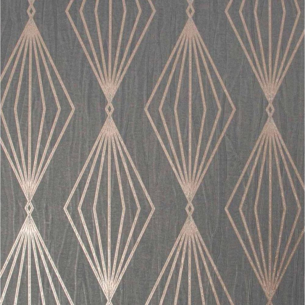 Artdeco jellegű,fényes, csillogó rozéarany mintás, szürke alapú, texturált felületű tapéta.