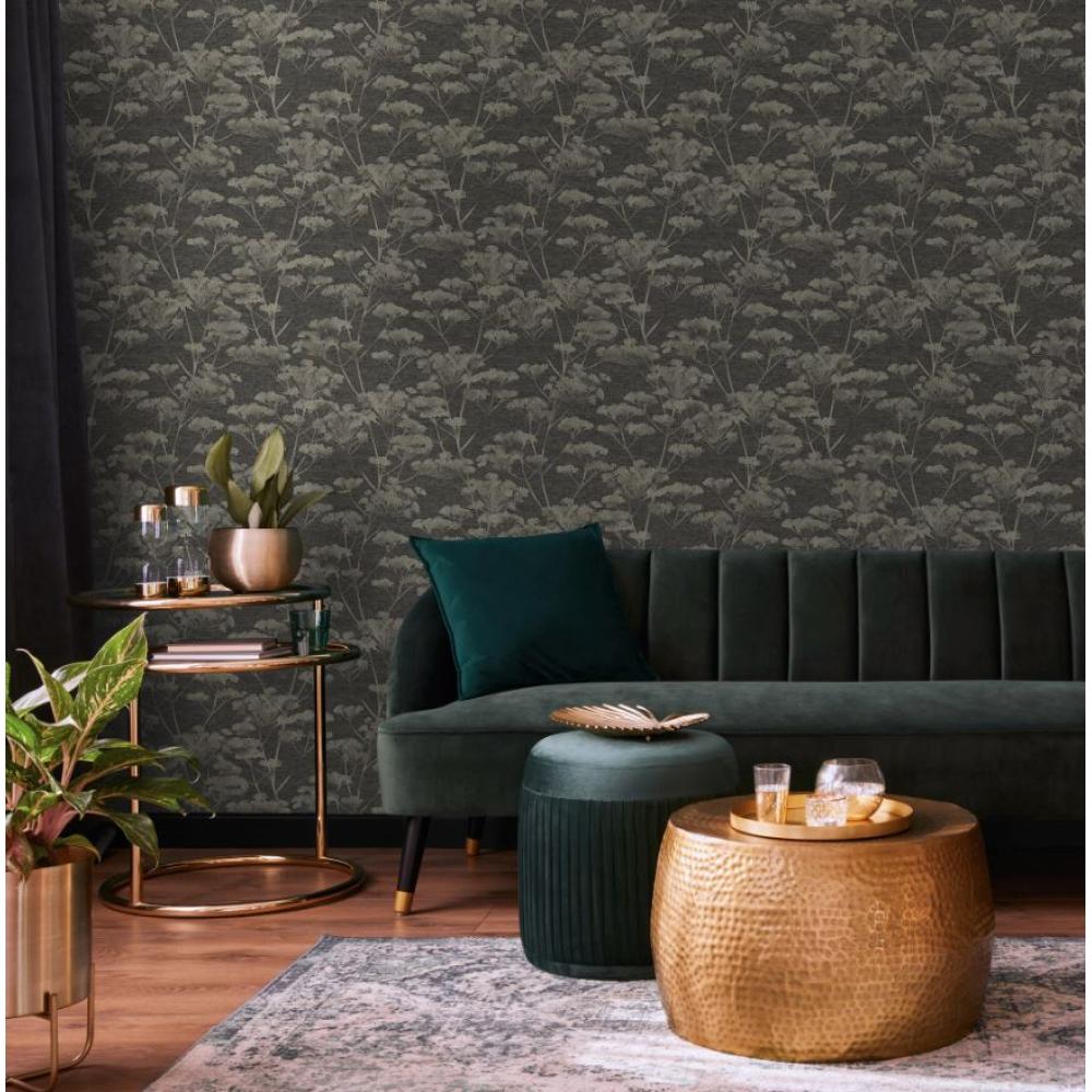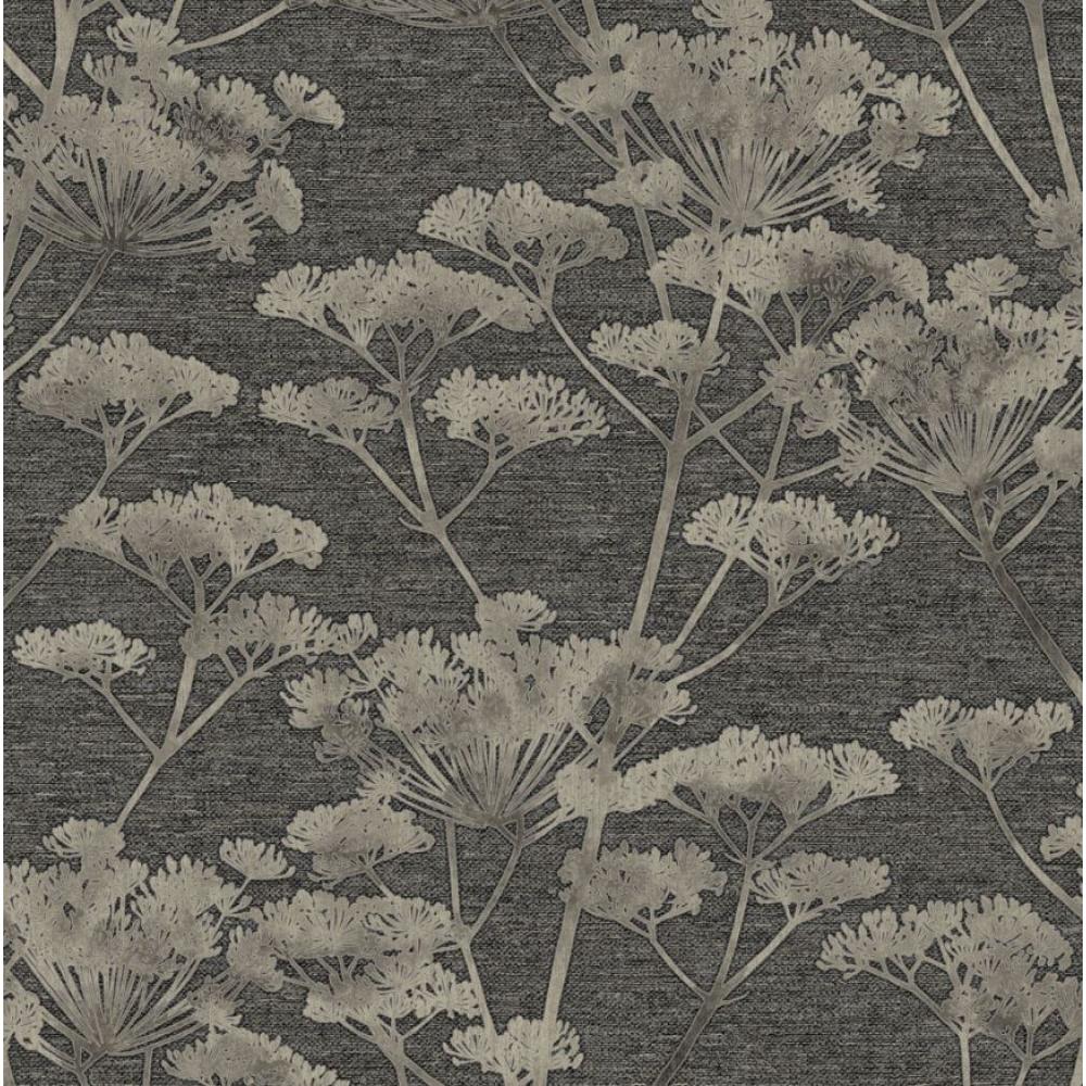Ezüst, fényes vadvirág mintás,sötétszürke alapú, texturált felületű tapéta.