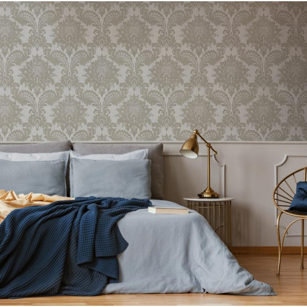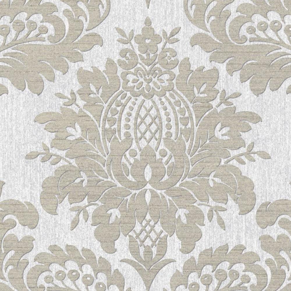 Világosszürke alapszínű, arany barokk mintás, strukturált felületű tapéta.