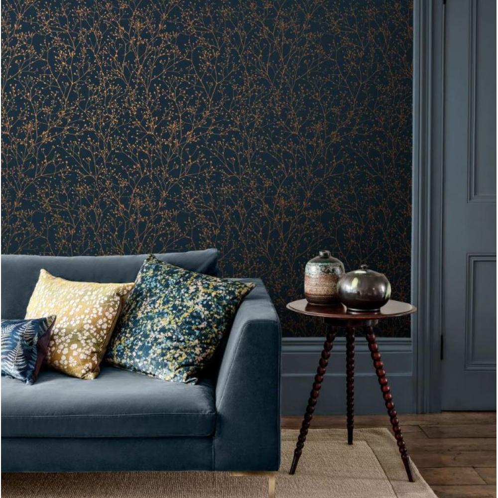 Elgáns,bronzos vadvirág mintájú, sötétkék alapszínű tapéta.