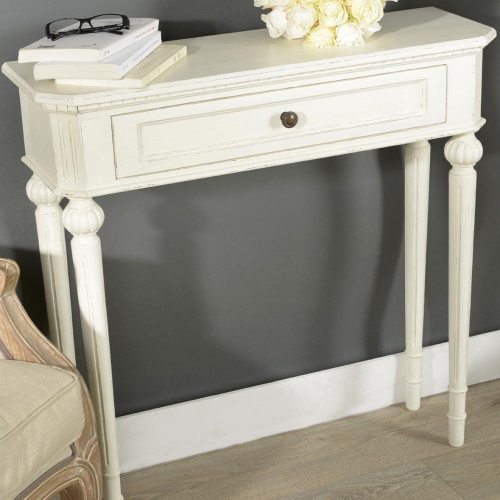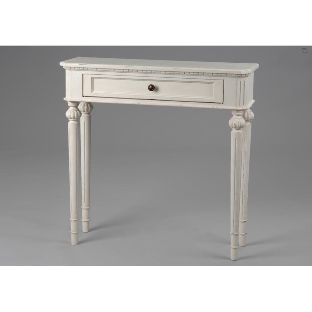 Provence-i stilusú, kézzel gyártott fehér, egyedi, patinázott konzolasztal.