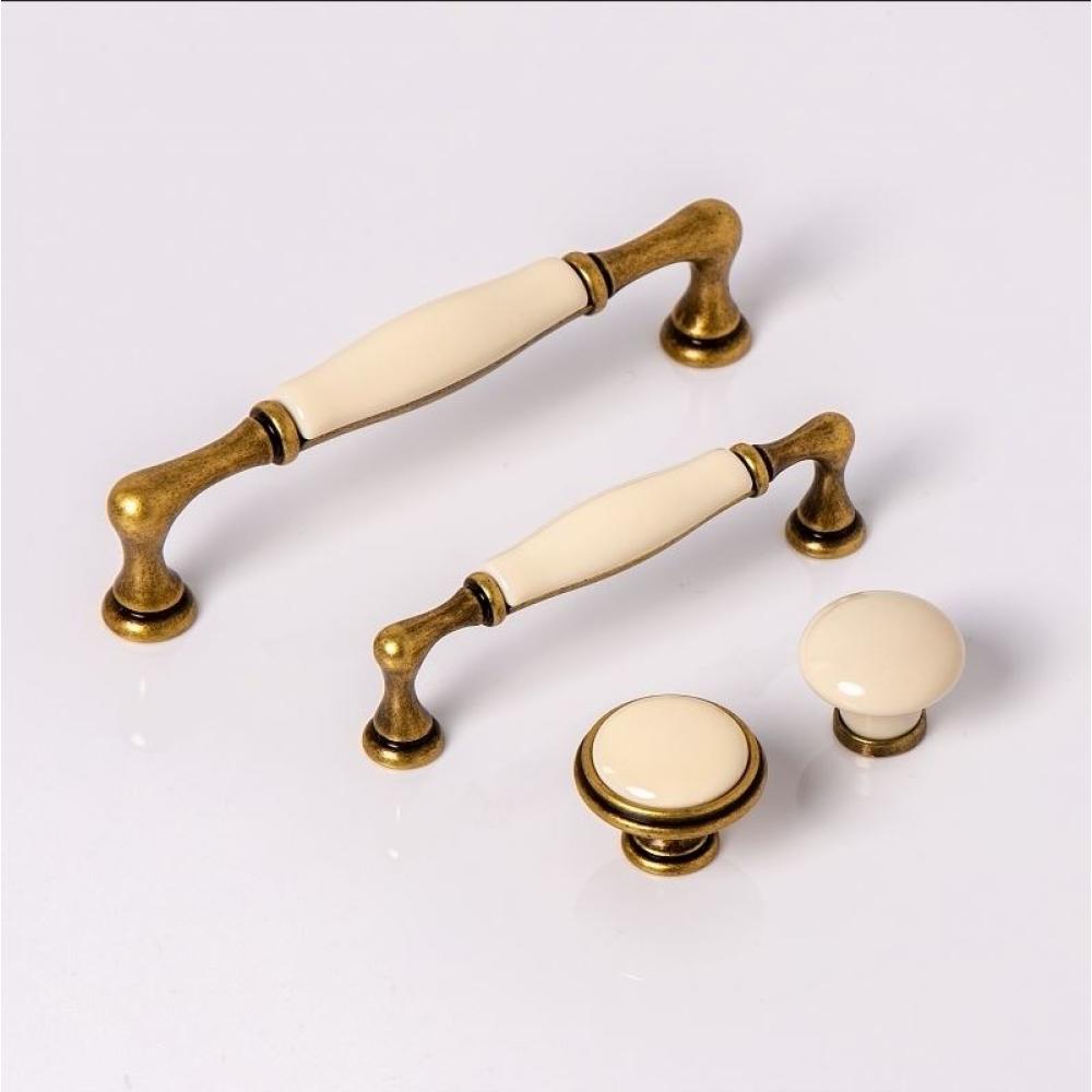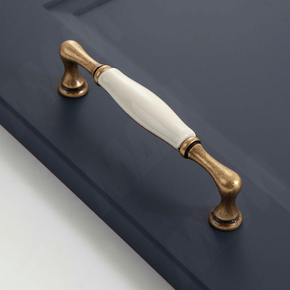 Klasszikus stílusú, bútor fogantyú, antikolt réz fogantyú, elefántcsont színű porcelán fogantyúval.