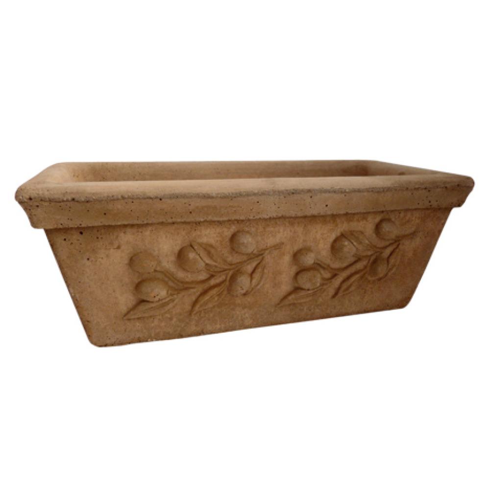 Fagyálló betonból készült, olivás dekorációval ellátott kültéri virágláda