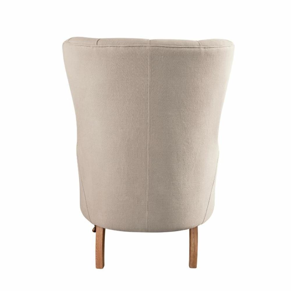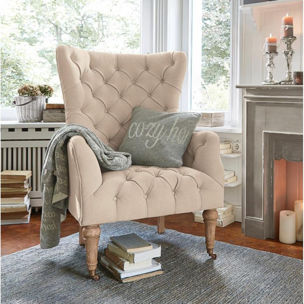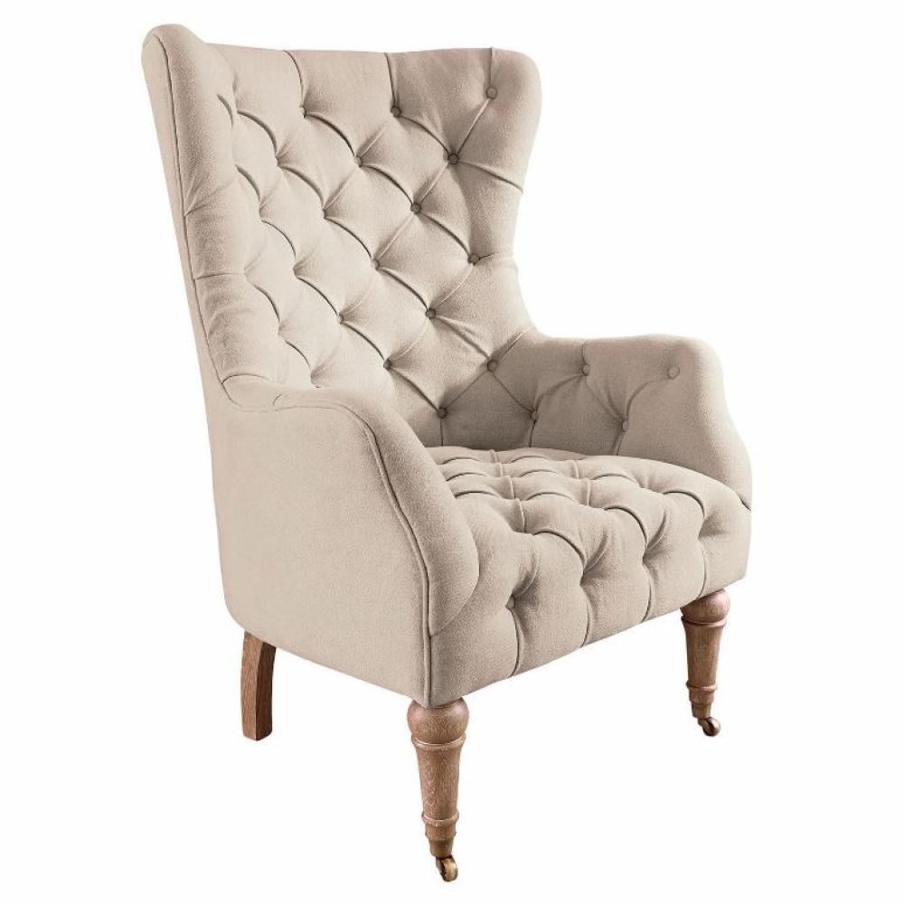 100% lenvászon kárpitozású klasszikus Chesterfield jellegű tűzéssel. A puha párnázott háttámla extra kényelmet biztosít. Ennek a kiváló minőségű fotelnek a klasszikus stílusa hagyományos dizájnból és kidolgozott Chesterfield tűzésből áll. A szerkezet tömör fenyőből készült, az elülső lábak esztergált nyírfából vannak. Két görgő egészíti ki az antik megjelenésű első lábakat, és mozgathatóvá teszi ezt a nagy, párnázott fotelt.