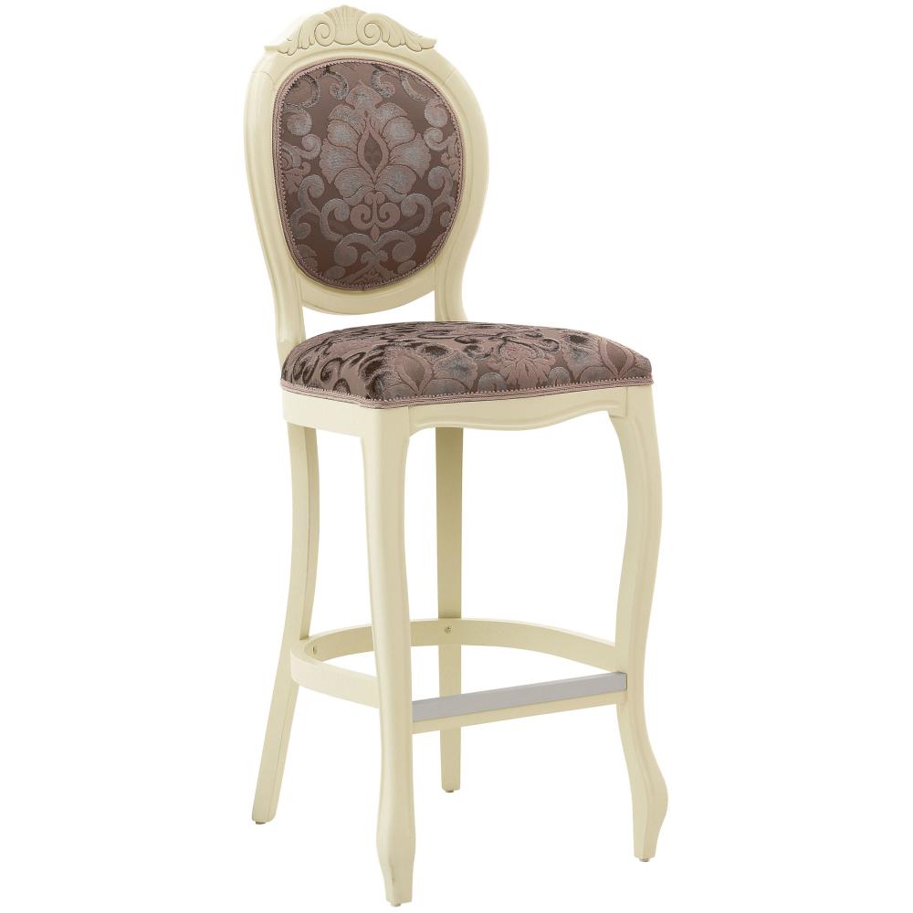 Kényelmes, klasszikus stílusú bárszék bükkfa szerkezettel. A háttámla felső részén lévő faragás arany vagy ezüst levéllel lakkozott felülettel fokozható. Az ülés hevederrel, három rugóval és kiváló minőségű habbal van kipárnázva. Ajánljuk elegáns villákba, kastélyba, felső kategóriás polgári szalonokba, nappaliba. A bútor Olaszországban készül, felsőkategóriás, kézzel készült termék!
