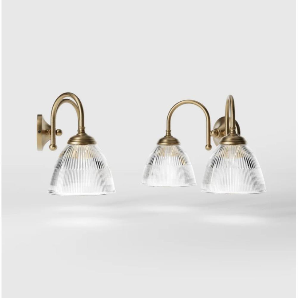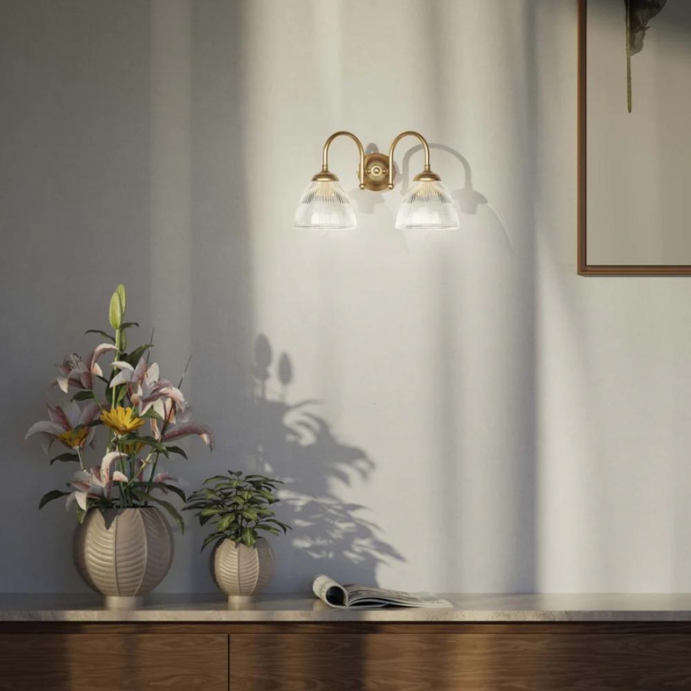Olaszországban készült klasszikus sárgaréz két izzós falikar, átlátszó üvegbúrával.