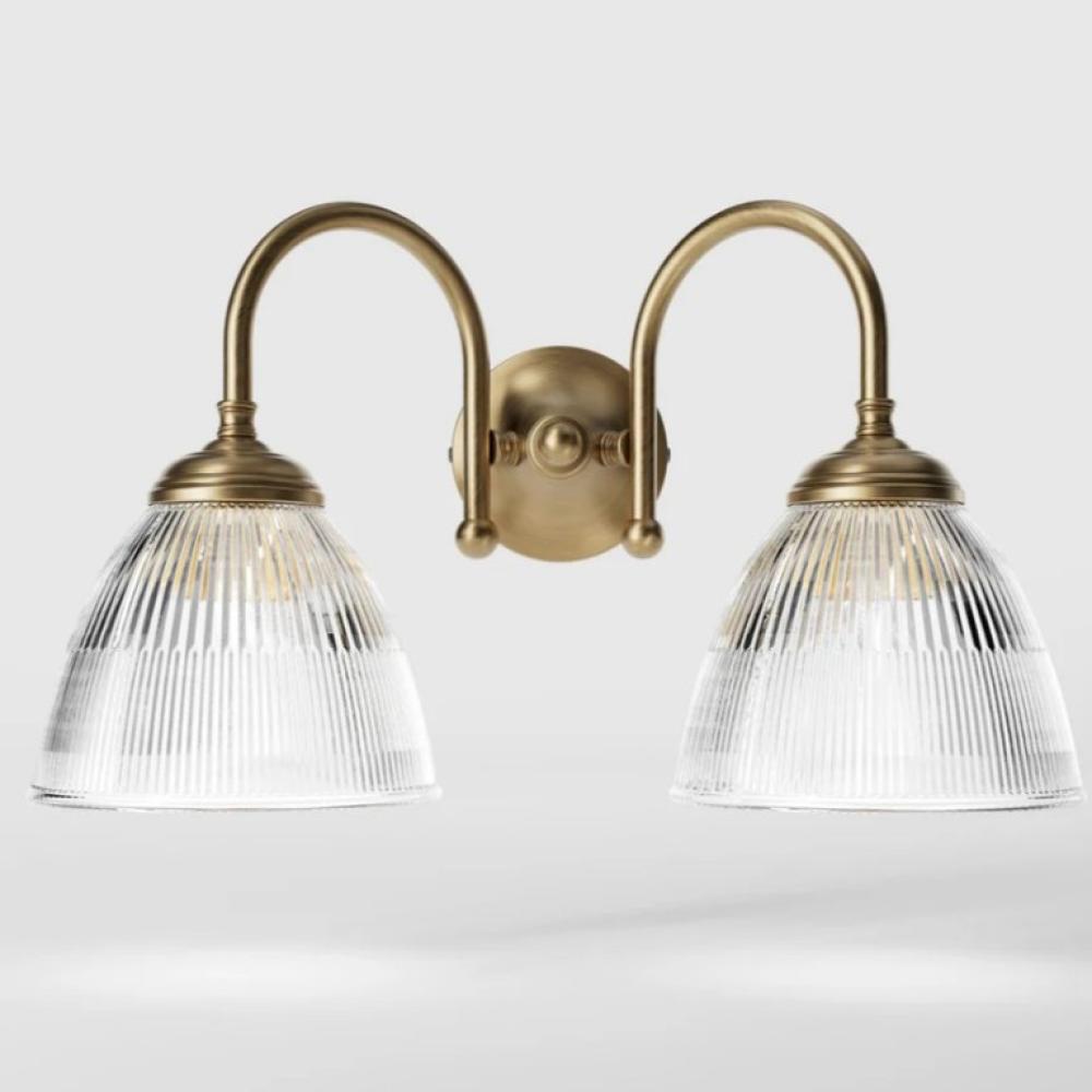GH Country stilusú sárgaréz falikar, két izzós lámpa, üvegbúrákkal