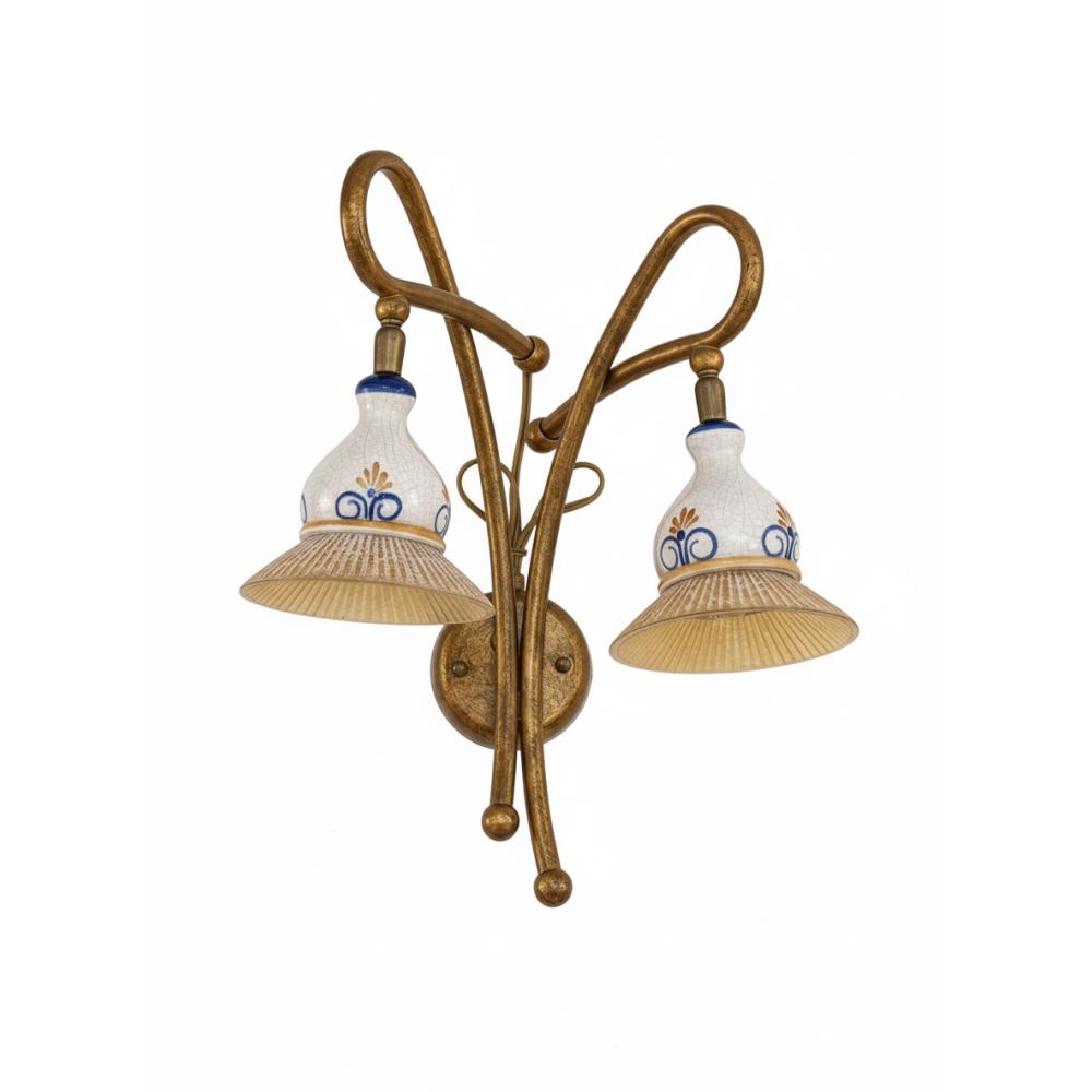 SI Kézzel festett antikolt réz szerkezetű falikar szájjal fújt üvegbúrával, kétizzós / készleten, utolsó 1 db