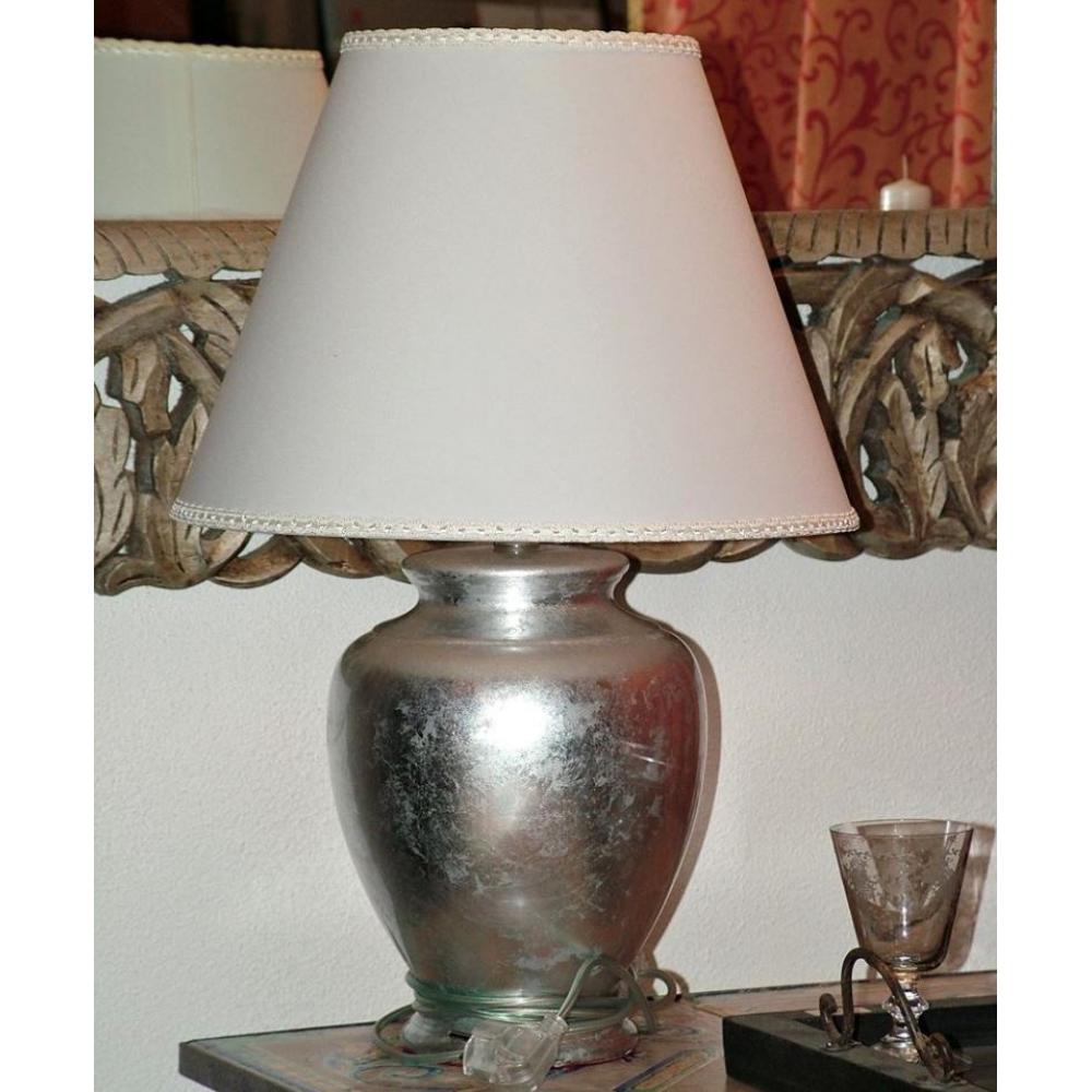 Az ezüst fóliás hande made felületkezeléssel készült asztali lámpát ajánljuk elegáns polgári lakásba, mediterrán, provanszi stílusú házba az étkezőbe a tálaló két oldalára, hálószobába az éjjeli szekrényre vagy előtérbe, nappaliba egy konzolra helyezve.