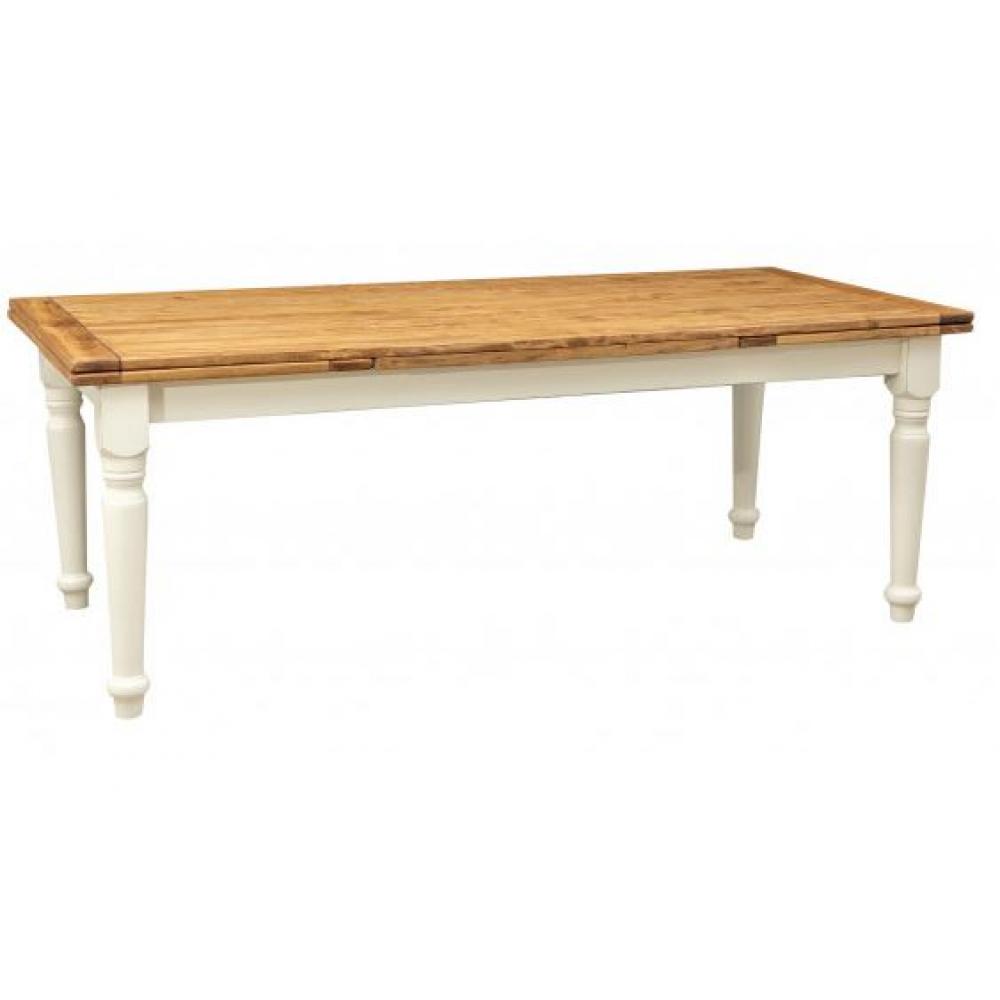 A tömör hársfa anyagból készülő country stílusú asztal festett fehér színű esztergált lábai, valamint a patinázott, natúr színű asztallap igényes bútort foglal magába.