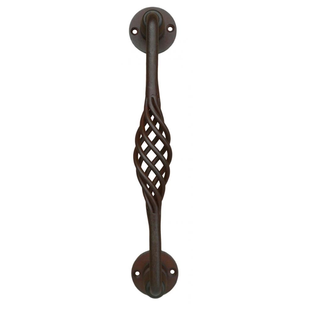 Klasszikus stílusú, kovácsoltvas ajtó fogantyú, antik rozsda színben, díszes csavart fogantyúval.