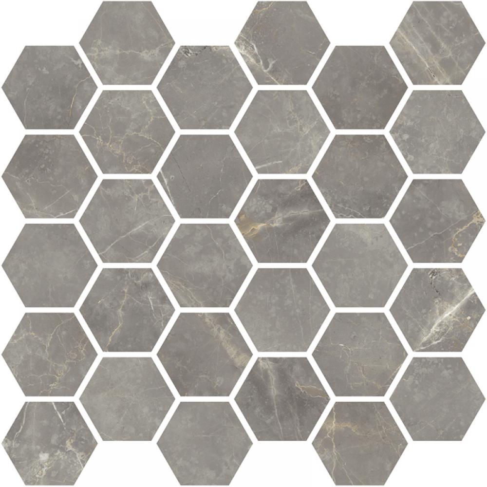 Hexagon alakú, szürke márványmintás mozaik greslap. A márvány hatású csempék minden színben és méretben elegáns és luxus hatást kölcsönöznek.