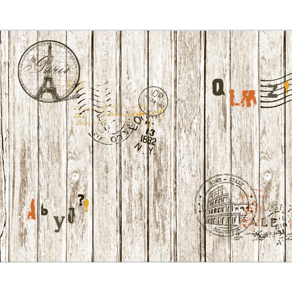 A világos fahatású, mosható tapéta, bélyegző mintával és sárga csillogó feliratokkal izgalmas és természetközeli látványt biztosít városi lakásba, kávézókba, nappalikba.